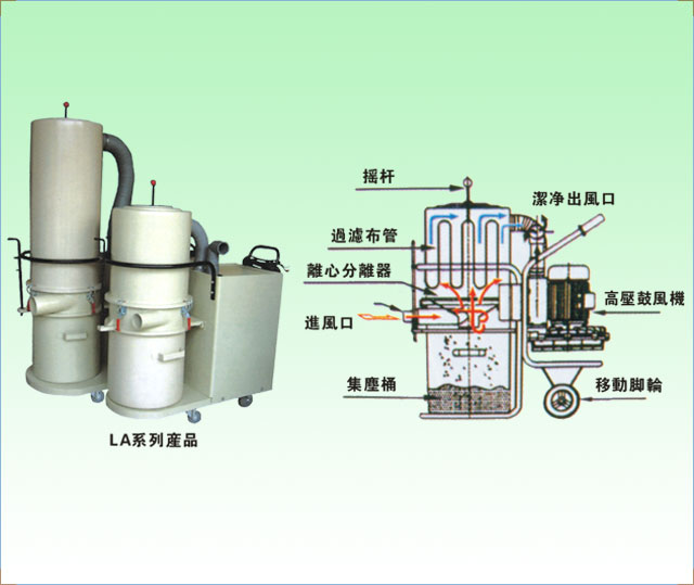 設備體積小,處理風量大; 一次除塵利用離心力原理分離大顆粒及成團的粉塵;二次集塵采用內(nèi)濾式集塵濾袋手動搖桿.可清除滯留在濾袋內(nèi)側(cè)的細微塵;常用于工位少粉塵產(chǎn)生量多的場所,如石材加工、各種機械、鑄造、家具木業(yè)、五金電子、化工涂料、冶金建材、輕紡、礦山采掘等; | |