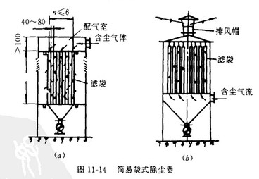 簡易清灰袋式除塵器包括各種的簡易清灰方法,有靠濾袋表面沉積粉塵層自重自行脫落的,有人工拍打的,有設(shè)手工搖動(dòng)機(jī)構(gòu)的,也有利用空氣振動(dòng)的。圖11—14所示為簡易袋式除塵器的兩種型式,其中(a)為上進(jìn)氣的,(b)為下進(jìn)氣的,皆為正壓、內(nèi)濾式結(jié)構(gòu),凈氣由百葉窗或風(fēng)帽排出,清灰靠粉塵層自重脫落及人工定期拍打。